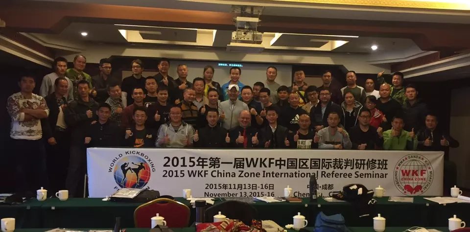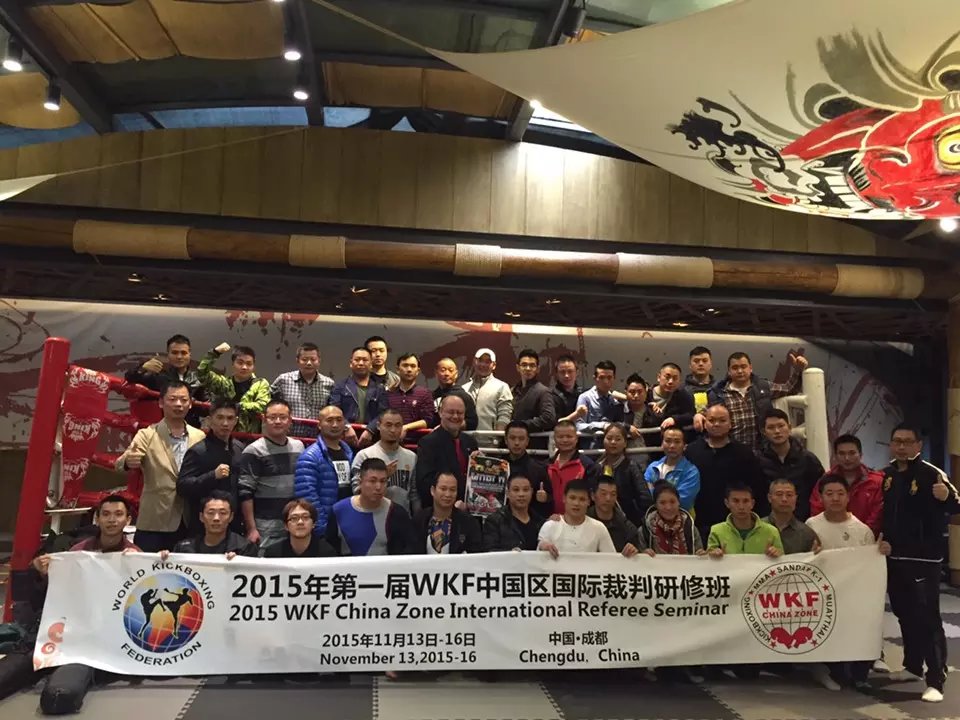 “2015年第一届WKF中国区国际裁判研修班”于11月13日至16日在成都举行。本届研修班共有来自全国各省、市和地区的66名武术教育、搏击赛事从业者报名参加培训。通过场裁实践操作和理论笔试考核,本次研修班共有60人成功获得WKF裁判资格。其中获得国际B级裁判1人、国际C级裁判5人、国家级(待定国际级)裁判54人。以上裁判均获得“2016年WKF意大利世界自由搏击锦标赛”执裁资格!